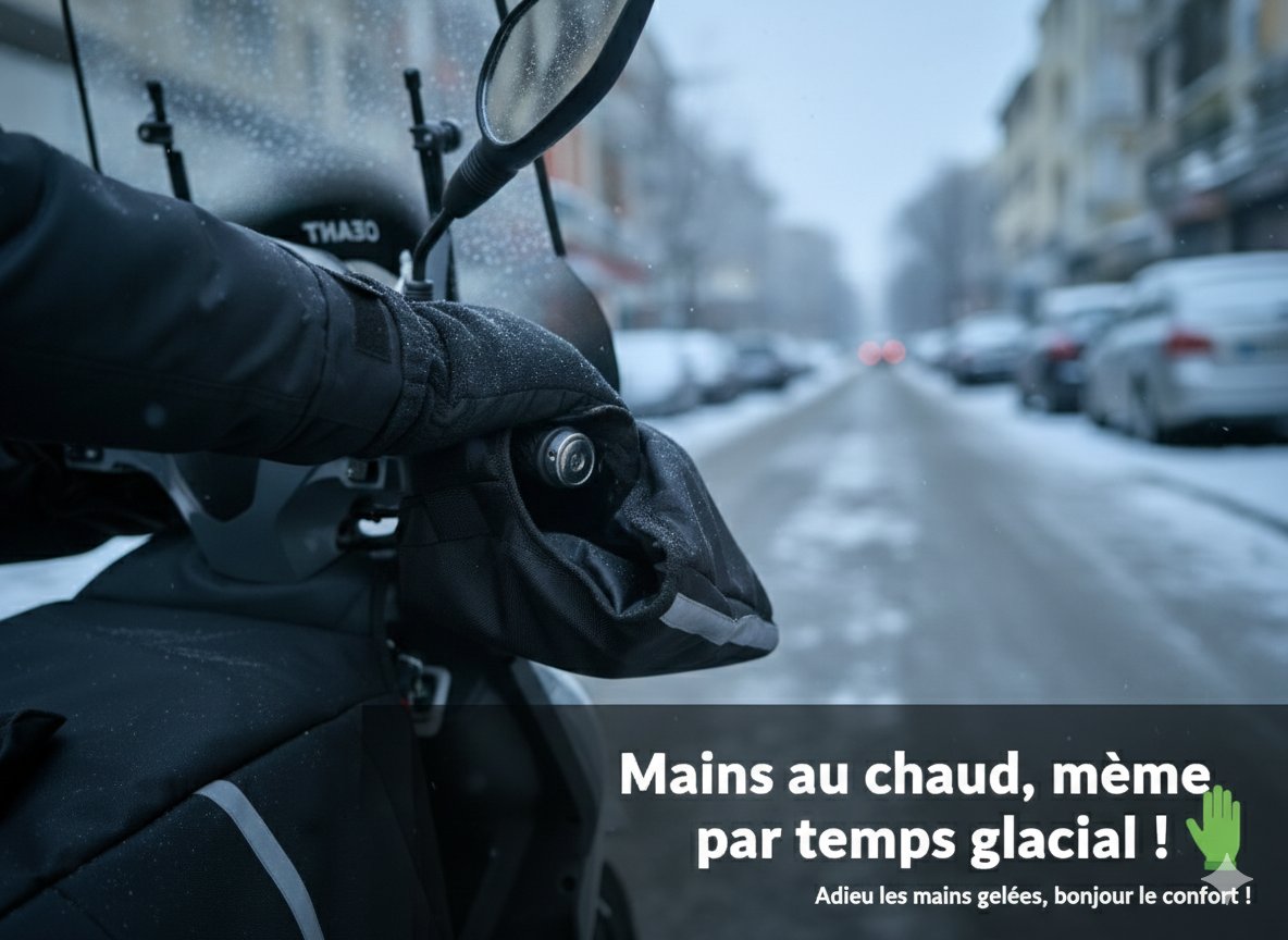 - 🧤 أكمام المقود الواقية (Manchons): تُثبت مباشرة على المقود لحماية يديك من الرياح الجليدية والرطوبة. وداعاً لتجمد الأصابع أثناء القيادة!