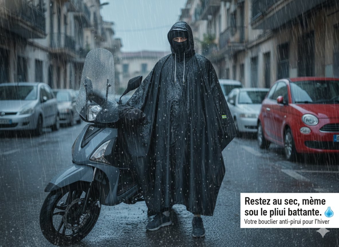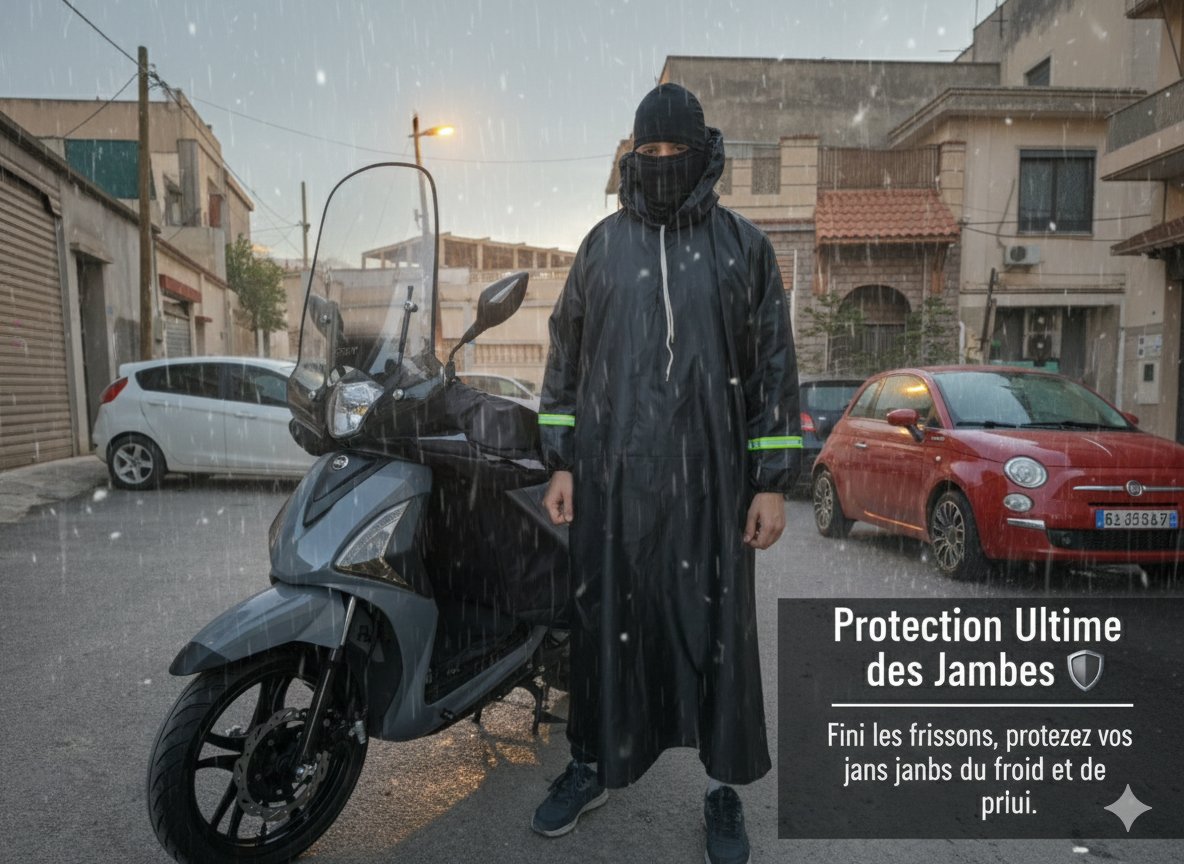 - 🛵 غطاء الأرجل الواقي (Tablier): تصميم “فستان” متين يُثبت لحماية الساقين والركبتين من البرد القارس، مما يحافظ على حرارة جسمك طوال الطريق.